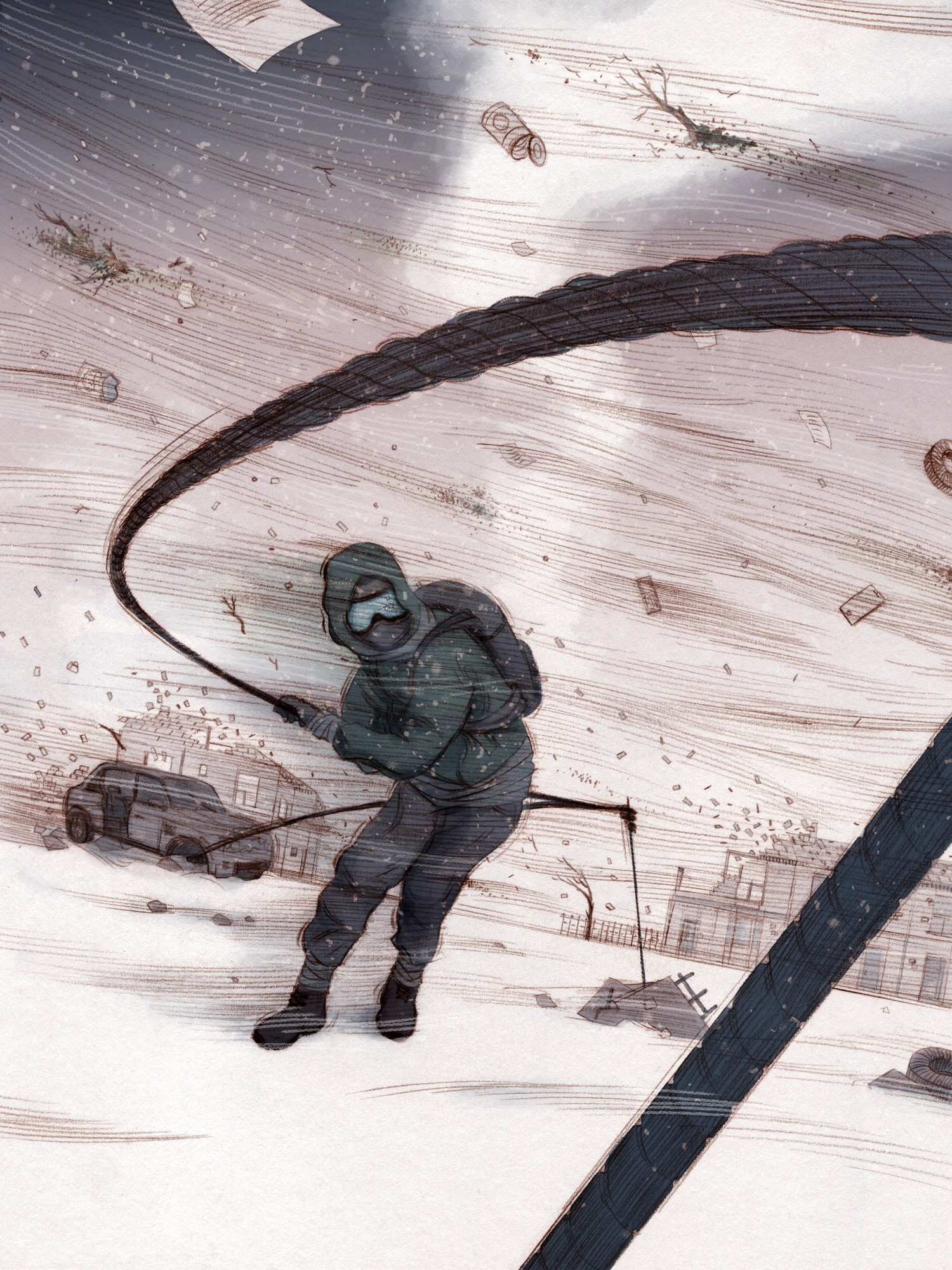 It describes a post-apocalyptic world in which a tempest constantly rages and supplies are scarce.